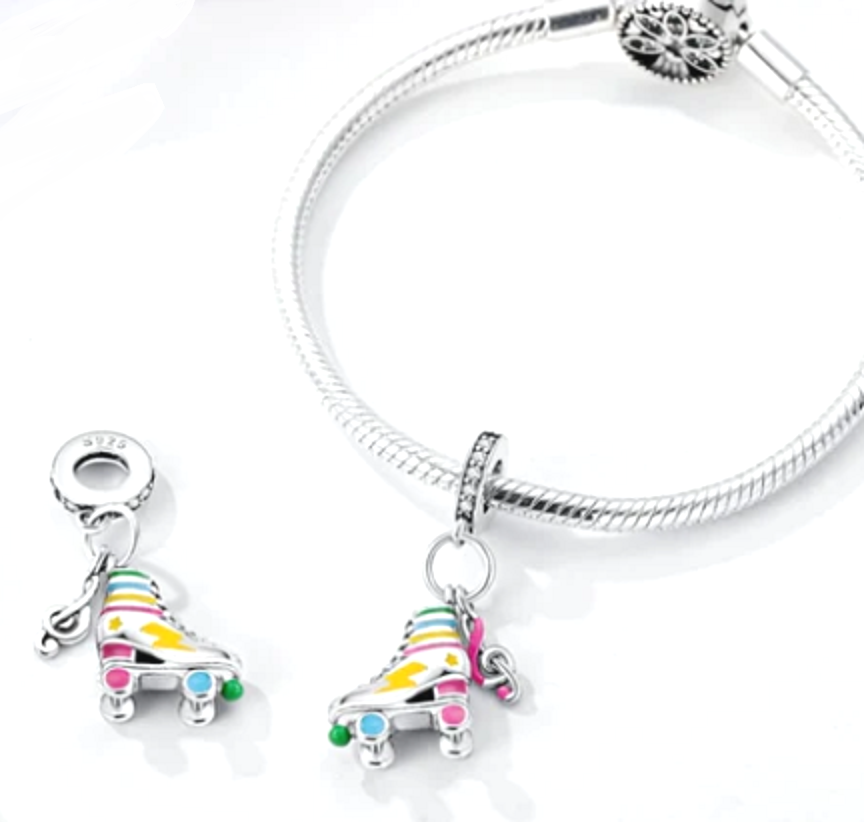 925 Sterling Silver zářící v přívěsku s kolečkovými bruslemi a houslovým klíčem, dekorovaný s hladkým barevným smaltem a bílými třpytivými drahokamy Zirkonu. Vyprávějte svůj příběh s každým přívěskem a vytvořte náramek, který odráží, kdo jste. Tvůj styl. Váš náramek. Tvůj příběh.