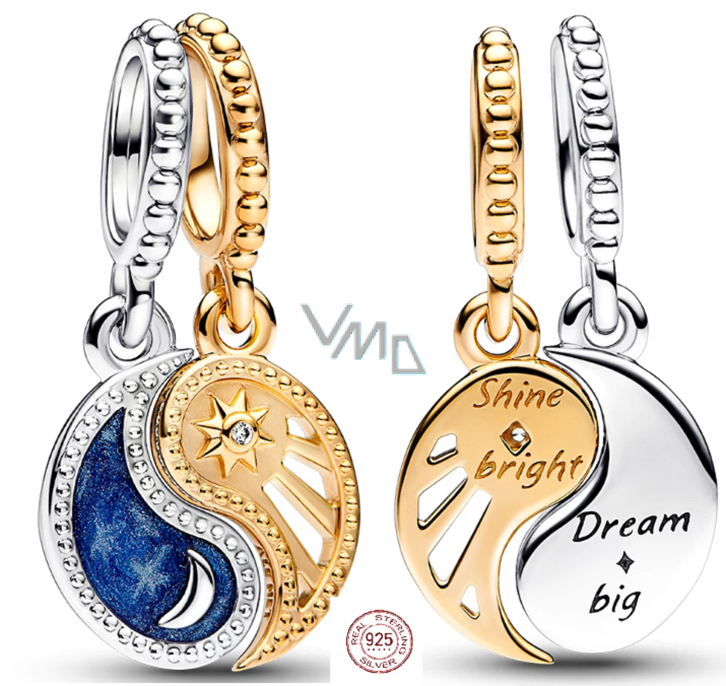 Noste symboly Yin & Yang, které vás vedou a inspirují pomocí dvoubarevného rozdělitelného přívěsku Sun & Moon. Tento sdílený přívěsek kombinuje starodávné symboly: slunce a měsíc a Jin a Jang, které dohromady znamenají rovnováhu, harmonii a propojenost. Visací přívěsek Yang pozlacený má motiv vyvýšeného slunce s vyříznutými paprsky a rytinou „Shine bright“ Zař jasně, na zadní straně, zatímco přívěsek Yin ze sterlingového stříbra má motiv půlměsíce obklopený třpytivě modrým smaltem a vzkaz „Dream big “ Sni ve velké, vyryto na zadní straně.