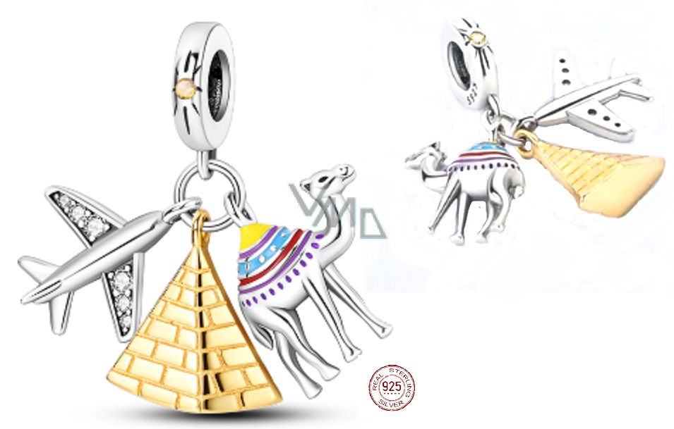 Charm Sterlingové stříbro 925 Egypt pyramida, velbloud, letadlo, 3v1 přívěsek na náramek cestování