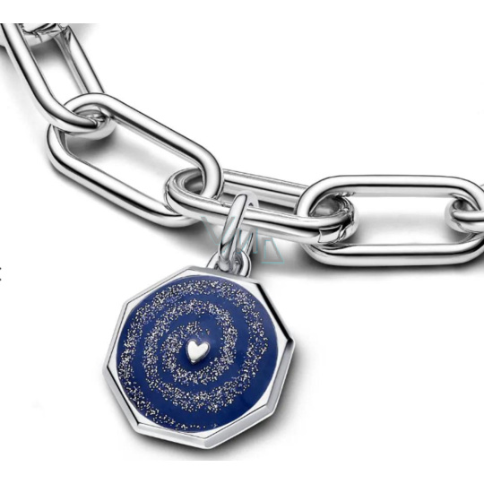 Pociťte vesmírnou lásku s mini přívěskem. Jedna strana tohoto osmihranného medailonového přívěsku z mincovního stříbra má vyvýšené srdce obklopené třpytivým tmavě modrým ručně aplikovaným smaltem. Na zadní straně je vyvýšené srdce obklopené vyříznutými paprsky s mikroperličkami. Tento medailonový přívěsek, navržený tak, aby byl stylizovaný na otevíratelné články, noste jako připomínku toho, že láska vždy vítězí a je srdcem našeho tajemného vesmíru. Kompatibilní s Pandora ME a Pandora Moments