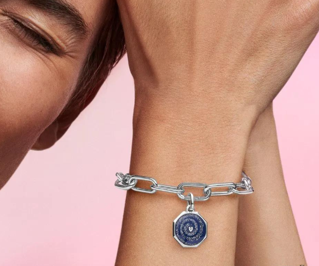 Pociťte vesmírnou lásku s mini přívěskem. Jedna strana tohoto osmihranného medailonového přívěsku z mincovního stříbra má vyvýšené srdce obklopené třpytivým tmavě modrým ručně aplikovaným smaltem. Na zadní straně je vyvýšené srdce obklopené vyříznutými paprsky s mikroperličkami. Tento medailonový přívěsek, navržený tak, aby byl stylizovaný na otevíratelné články, noste jako připomínku toho, že láska vždy vítězí a je srdcem našeho tajemného vesmíru. Kompatibilní s Pandora ME a Pandora Moments