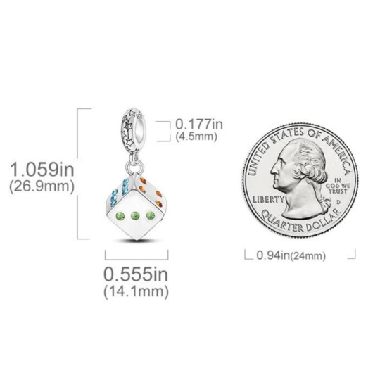 Stylový přívěsek ve tvaru Hrací kostky ze sterlingového stříbra 925, doplněn barevnými kamínky, je nejen krásným doplňkem, ale i silným symbolem odvahy, svobody volby a rozhodnutí. Jemné a detailní zpracování dodává šperku elegantní vzhled, který vynikne na každém náramku nebo řetízku. Je kompatibilní s většinou náramků známých značek.
