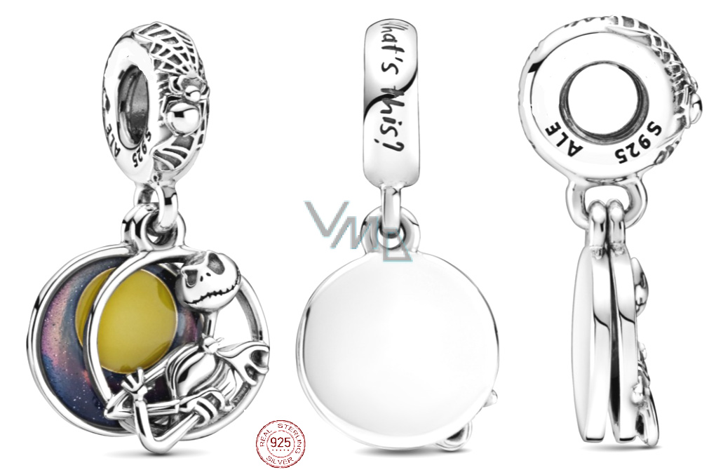 The Nightmare Before Christmas - ukradené Vánoce. Oslavte Halloween s Disney. Přívěsek ručně dokončený a vyrobený ze sterlingového stříbra, zadní disk zobrazuje měsíc v úplňku proti noční obloze, natřený ručně aplikovaným tmavě žlutým a Levandulovým čirým smaltem. Přední disk s prolamovaným zpracováním zobrazuje 3D verzi hlavního hrdiny Disneyho příběhu: Jacka Skellingtona. Háček obsahuje dekorace připomínající pavučiny, stejně jako logo Disney a rytinu „Co je to?“ Spárujte s dalšími kouzly inspirovanými dovolenou pro zábavný a zároveň strašidelný vzhled.