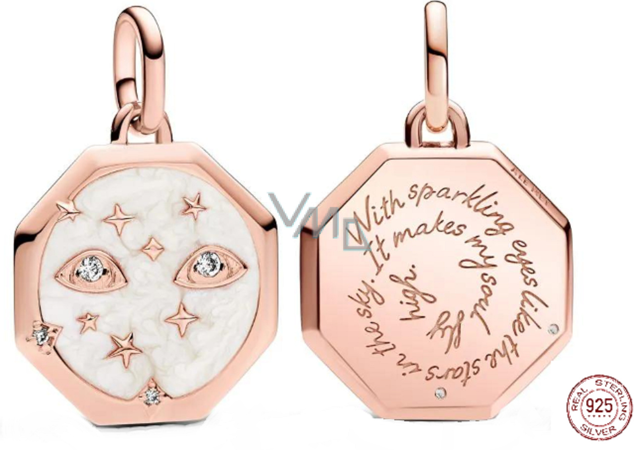 Všechny oči budou upřeny na vás, když budete nosit Medailonový přívěsek Jiskřivé oči. Tento medailonový přívěsek jemně pozlacený 14karátovým růžovým zlatem má tvar osmiúhelníku s vyrytým nápisem „S jiskřivýma očima jako Hvězdy na nebi. Na jedné straně jsou tvary oka a Hvězdy ručně osazeny kamínky, které se třpytí ze základu z třpytivého bílého smaltu. Detailní a jemné, toto oduševnělé kouzlo vám dá Hvězdy do očí.