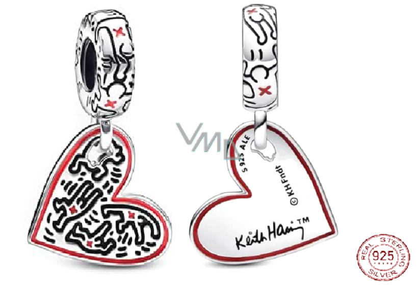 Charm Sterlingové stříbro 925 Keith Haring srdce Umění linek, lidé a srdce, přívěsek na náramek