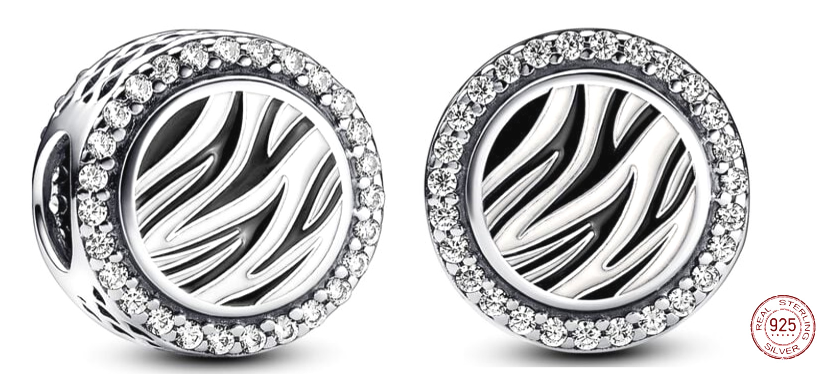Kulatý přívěsek se zvířecím potiskem zebry má na na přední a zadní straně přívěsku pravé kubické zirkonie, po stranách vyříznutý diamantový vzor. Tento přívěsek byl inspirován potisky zebry, které představují krásné vzory z přírody, divokých zvířat a rostlin, zebry jsou fascinující zvíře, které je běžné ve volné přírodě i v džungli.
