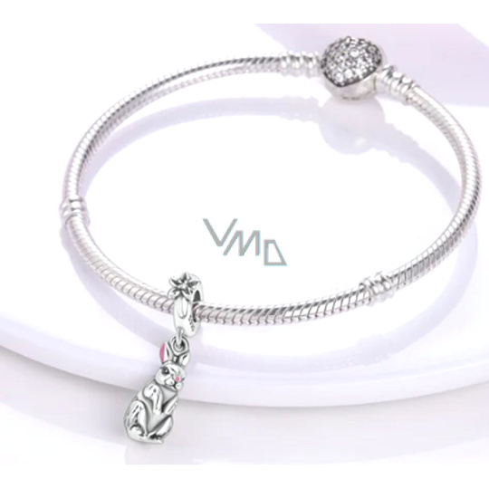 Visací přívěsek 925 Sterling Silver s roztomilým zajíčkem s růžovým nosem. Na prstenu přívěsku je květina dekorovaná růžovým třpytivým zirkonovým drahokamem. S každým přívěskem vyprávěj svůj příběh a vytvoř si náramek, který odráží, kdo jsi. Tvůj styl. Tvůj náramek. Tvůj příběh.