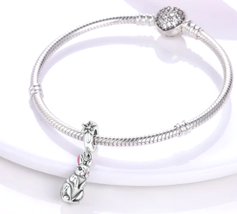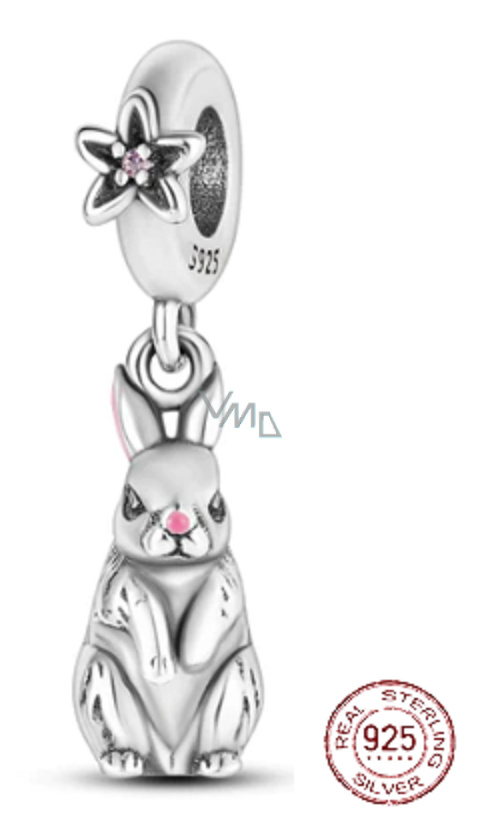 Visací přívěsek 925 Sterling Silver s roztomilým zajíčkem s růžovým nosem. Na prstenu přívěsku je květina dekorovaná růžovým třpytivým zirkonovým drahokamem. S každým přívěskem vyprávěj svůj příběh a vytvoř si náramek, který odráží, kdo jsi. Tvůj styl. Tvůj náramek. Tvůj příběh.