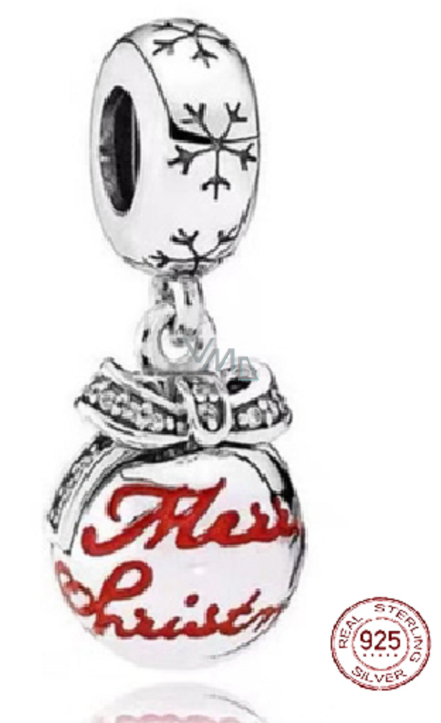 Přívěsek ze stříbra 925 v podobě slavnostní vánoční ozdoby ze stříbra, zdobený mašlí a nápisem "Merry Christmas!" který je z červeného smaltu.