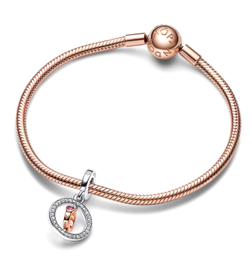 Dvoubarevný oboustranný prstenový přívěsek. Na pravém kroužku je vyryté srdce na zadní straně květina, vnitřní kroužek, který lze otáčet a převrácené kolem horní a dolní osy (horní a spodní osa jsou připevněny k vnějšímu kroužku), vnitřní kroužek je se syntetickou Kubickou Zirkonií ve tvaru srdce, mírně vyčnívající na jedné straně.