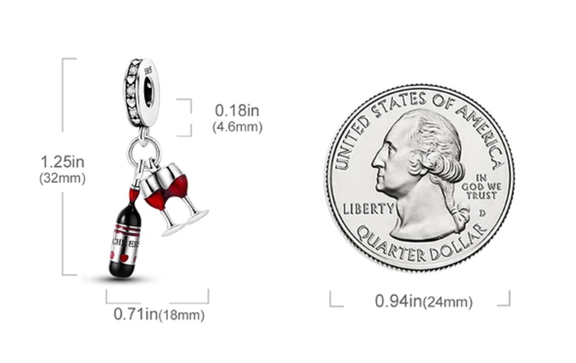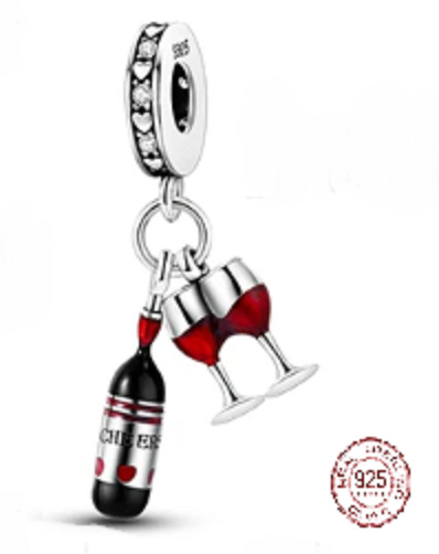 Visací přívěsek 925 Sterling Silver s lahví červeného vína se slovy „na zdraví“ na etiketě a dvěma skleničkami na víno s hladkým černým a červeným smaltem. Prsten obsahuje malá srdíčka a kolem dokola bílé třpytivé drahokamy Zirkonu. Vyprávějte svůj příběh s každým přívěskem a vytvořte náramek, který odráží, kdo jste a co je pro vás důležité. Tvůj styl. Váš náramek. Tvůj příběh.