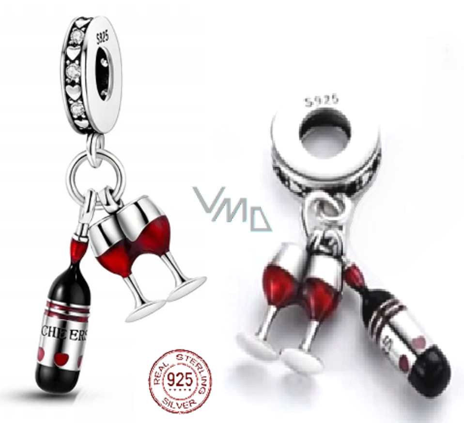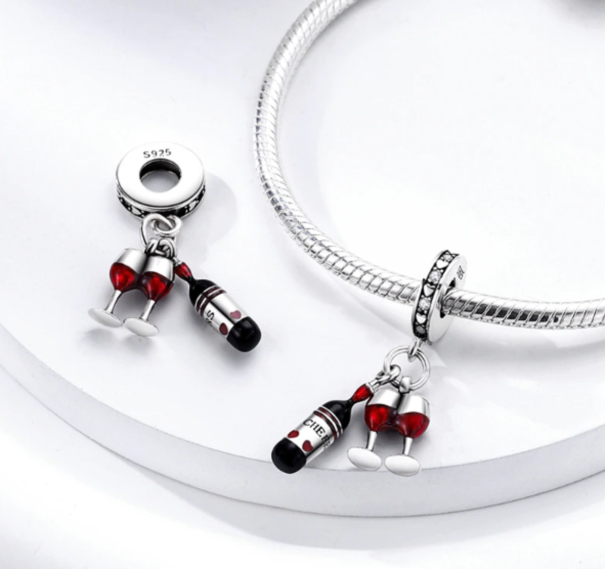 Charm Sterlingové stříbro 925 Miluji víno - láhev + skleničky, 2v1, přívěsek na náramek, jídlo a pití