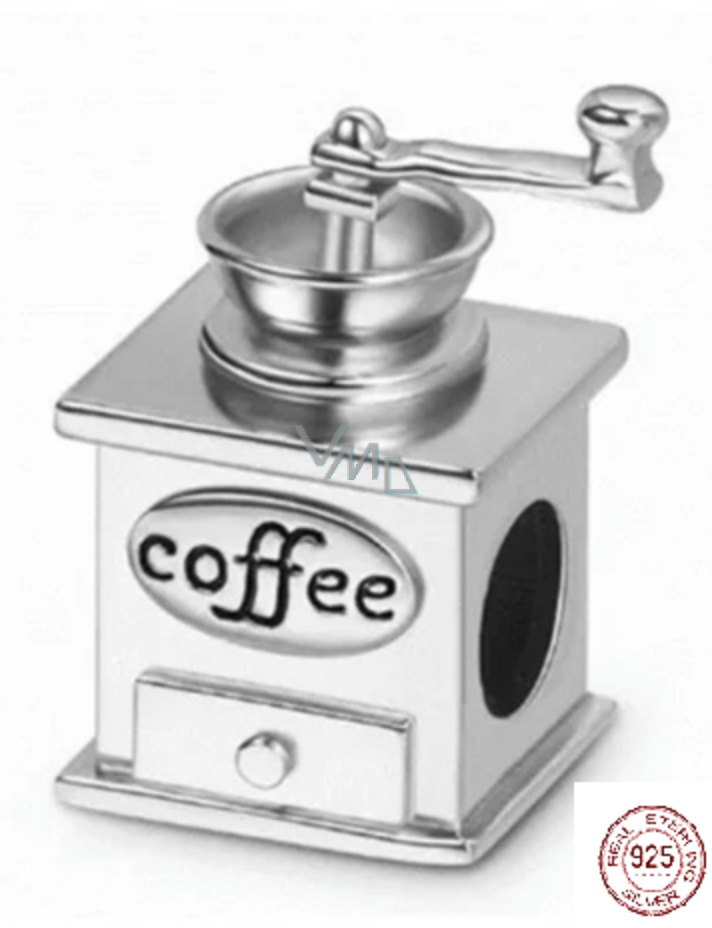 Charm Sterlingové stříbro 925 Mlýnek na kafe - ruční, retro, korálek na náramek, jídlo a pití