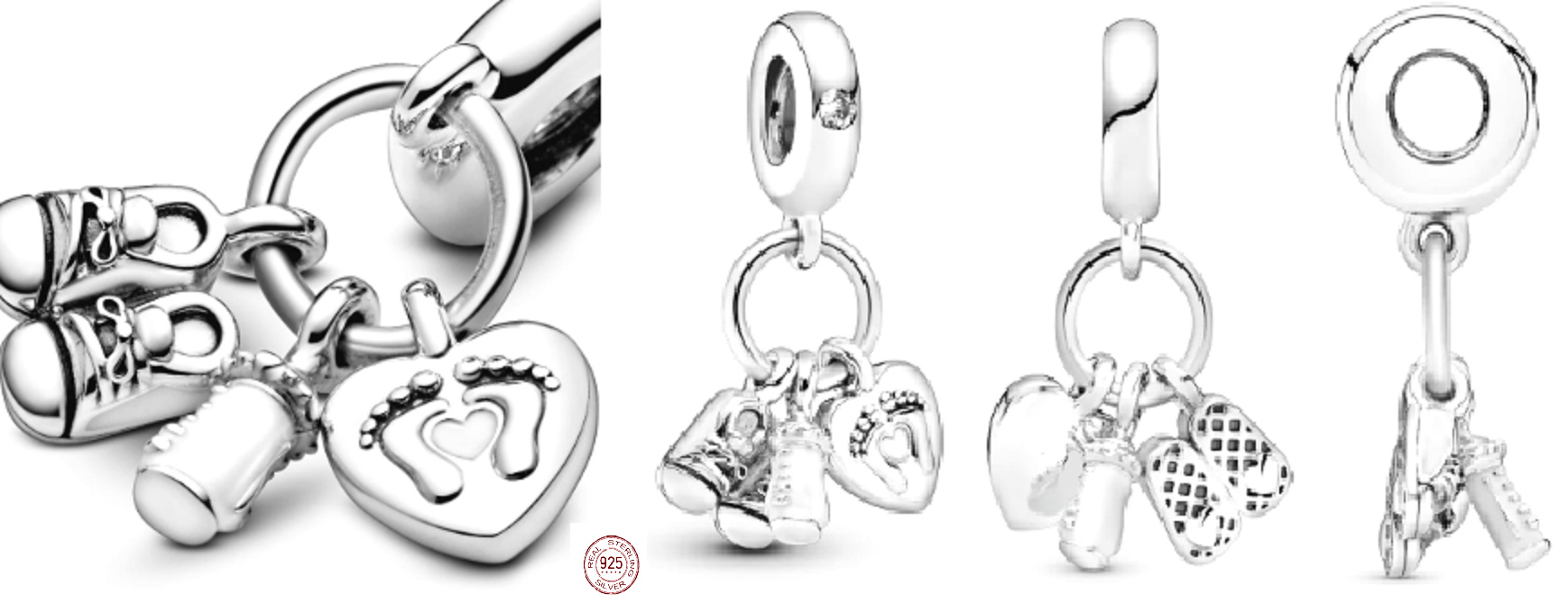 Charm Sterlingové stříbro 925 Moje děťátko, rodinné kouzlo s botami, lahvičkou a srdcem 3v1, přívěsek na náramek rodina