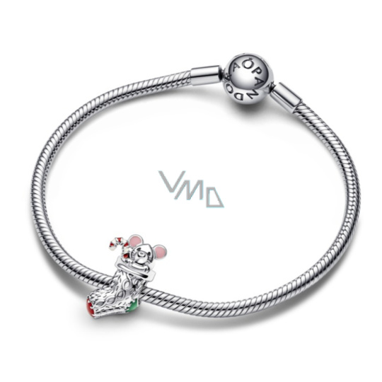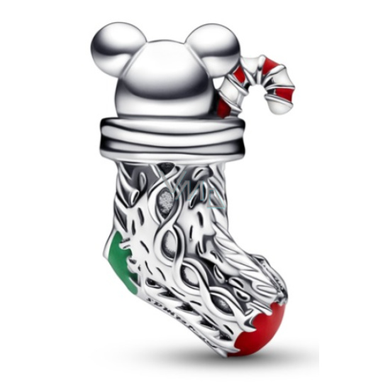 Stříbrný korálek myška ve vánoční ponožce s gravírovnáním "The magic of Christmas" (Kouzlo Vánoc) s červenou a růžovou glazurou. Ručně dokončený přívěsek ze stříbra 925 má tvar vánoční ponožky s realistickými pletenými detaily a roztomilou myškou a uvnitř vypadající cukrovou hůlkou. Darujte krásné chvíle radosti a štěstí. Potěšte vaše blízké milou vánoční myškou.