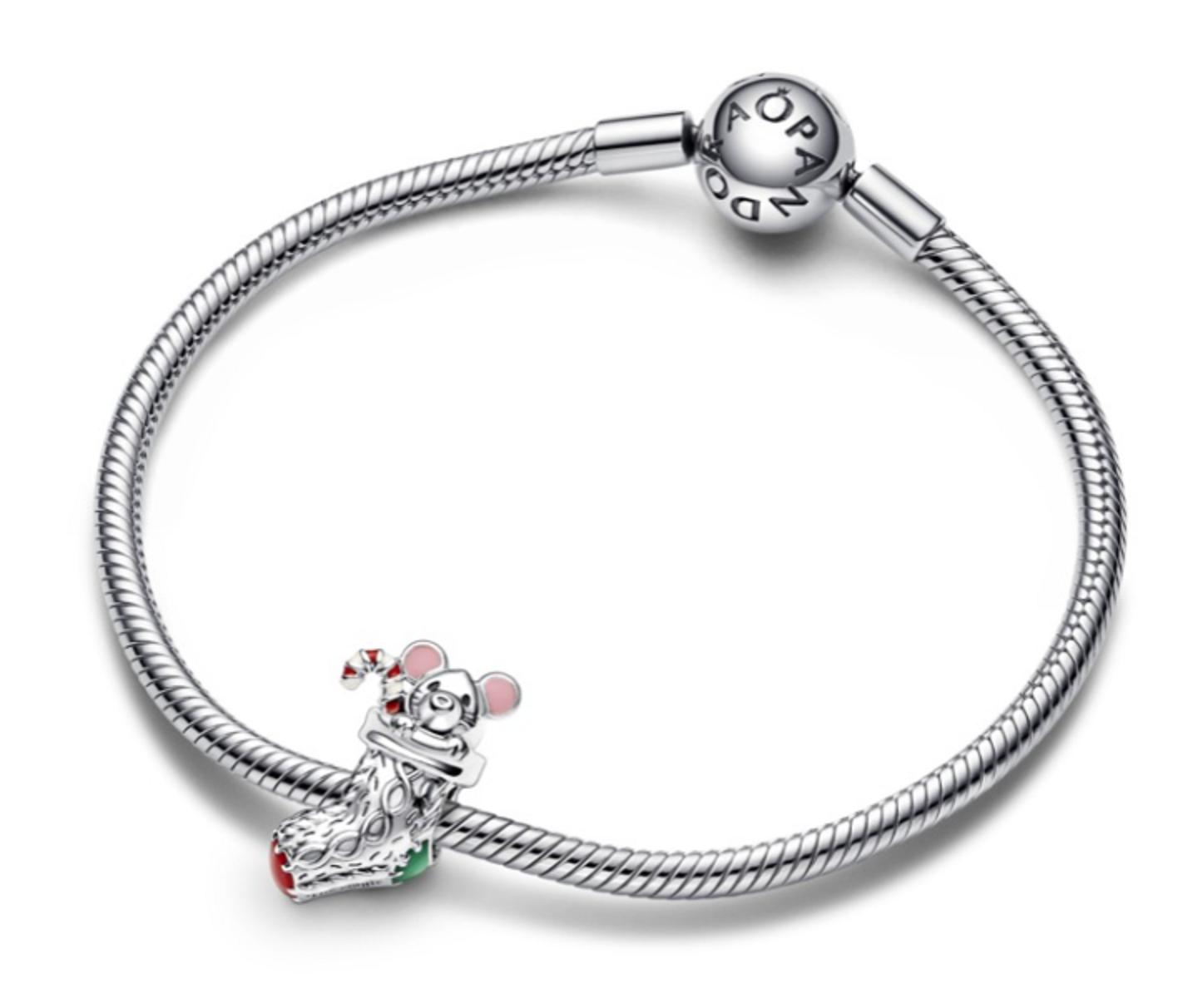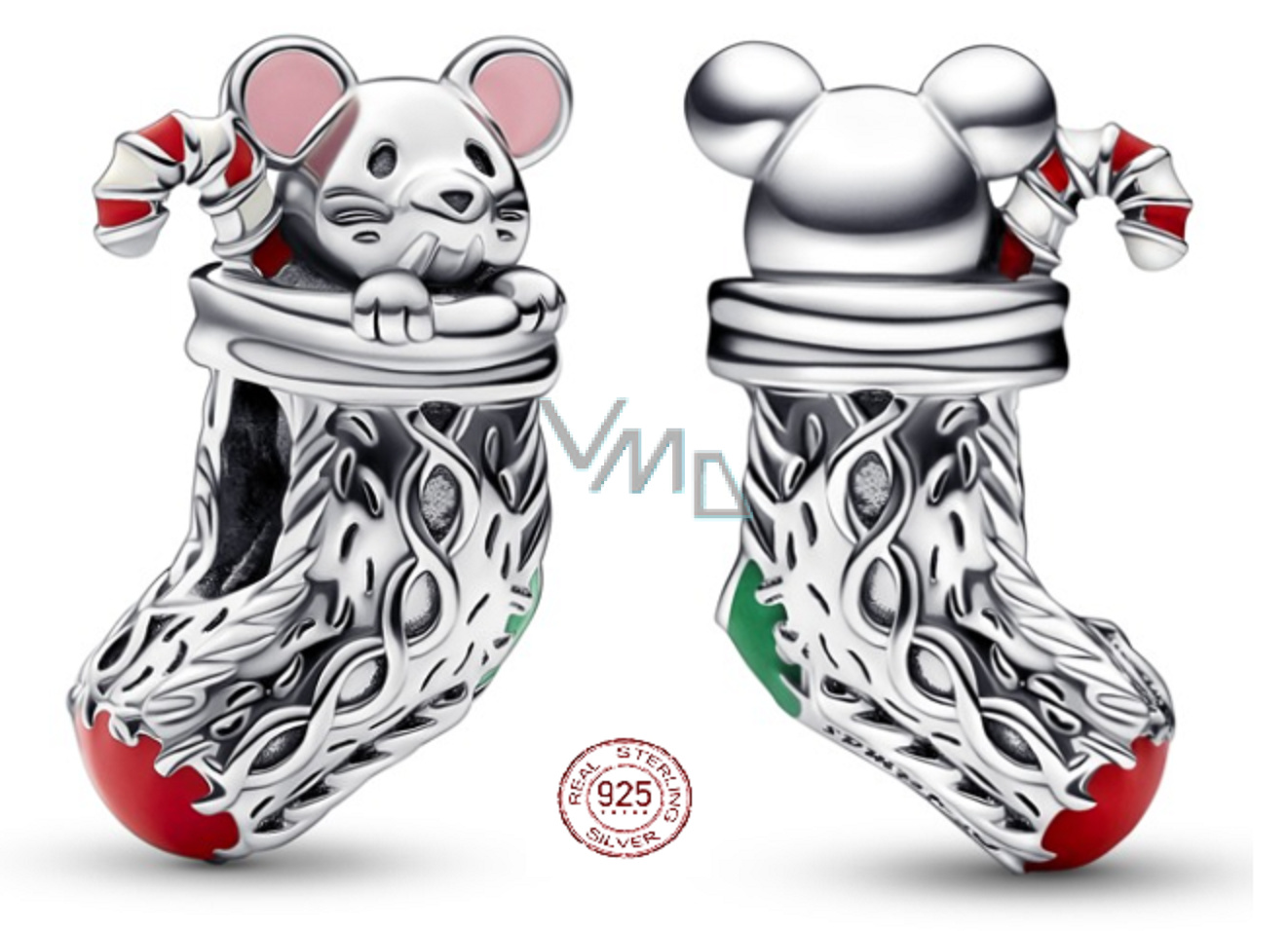 Stříbrný korálek myška ve vánoční ponožce s gravírovnáním "The magic of Christmas" (Kouzlo Vánoc) s červenou a růžovou glazurou. Ručně dokončený přívěsek ze stříbra 925 má tvar vánoční ponožky s realistickými pletenými detaily a roztomilou myškou a uvnitř vypadající cukrovou hůlkou. Darujte krásné chvíle radosti a štěstí. Potěšte vaše blízké milou vánoční myškou.