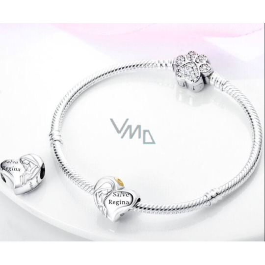 925 Sterlingové stříbro přívěsek ve tvaru srdce s Pannou Marií s pozlacenou svatozáří a na něm vyrytá slova „Salve Regina“, známá také jako „Hail Holy Queen“ - Zdrávas Svatá Královno. S každým přívěskem vyprávějte svůj příběh a vytvořte náramek, který odráží, kdo jste a co je pro vás důležité. Tvůj styl. Váš náramek. Tvůj příběh.