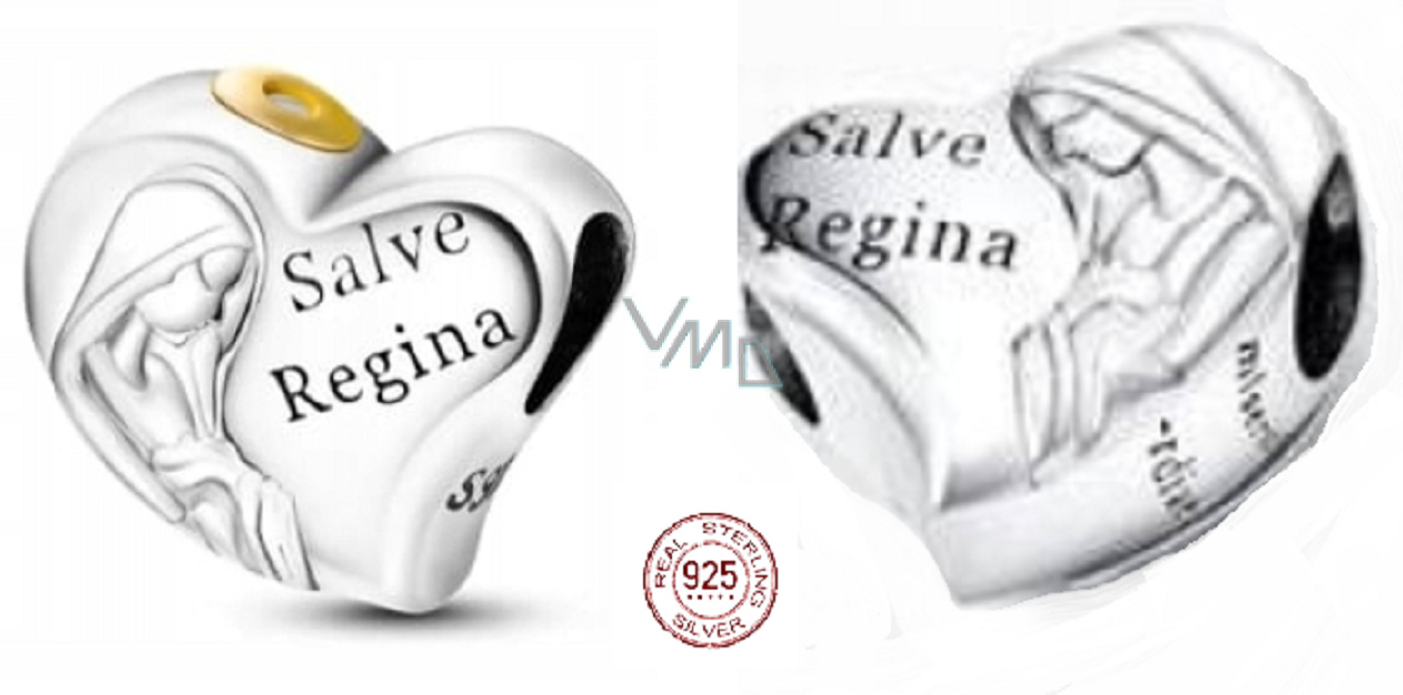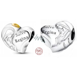 925 Sterlingové stříbro přívěsek ve tvaru srdce s Pannou Marií s pozlacenou svatozáří a na něm vyrytá slova „Salve Regina“, známá také jako „Hail Holy Queen“ - Zdrávas Svatá Královno. S každým přívěskem vyprávějte svůj příběh a vytvořte náramek, který odráží, kdo jste a co je pro vás důležité. Tvůj styl. Váš náramek. Tvůj příběh.