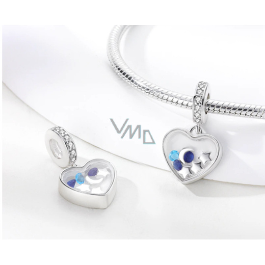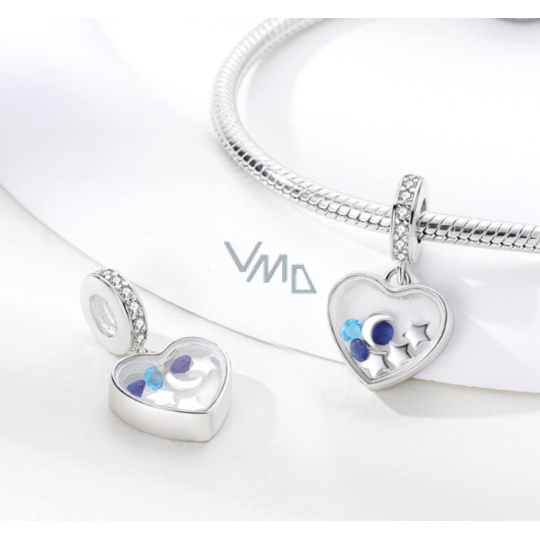 Visací přívěsek 925 Sterling Silver s průhledným srdcem s malým půlMěsícem, hvězdami a odstíny modrých třpytivých drahokamů Zirkonu. Prsten přívěsku obsahuje bílé drahokamy. S každým přívěskem vyprávějte svůj příběh a vytvořte náramek, který odráží, kdo jste a co je pro vás důležité. Tvůj styl. Váš náramek. Tvůj příběh.