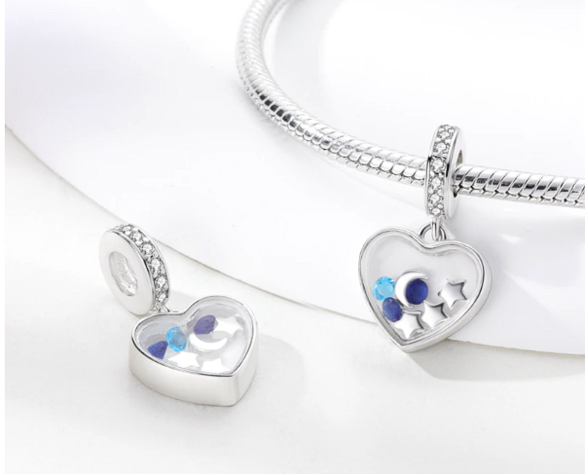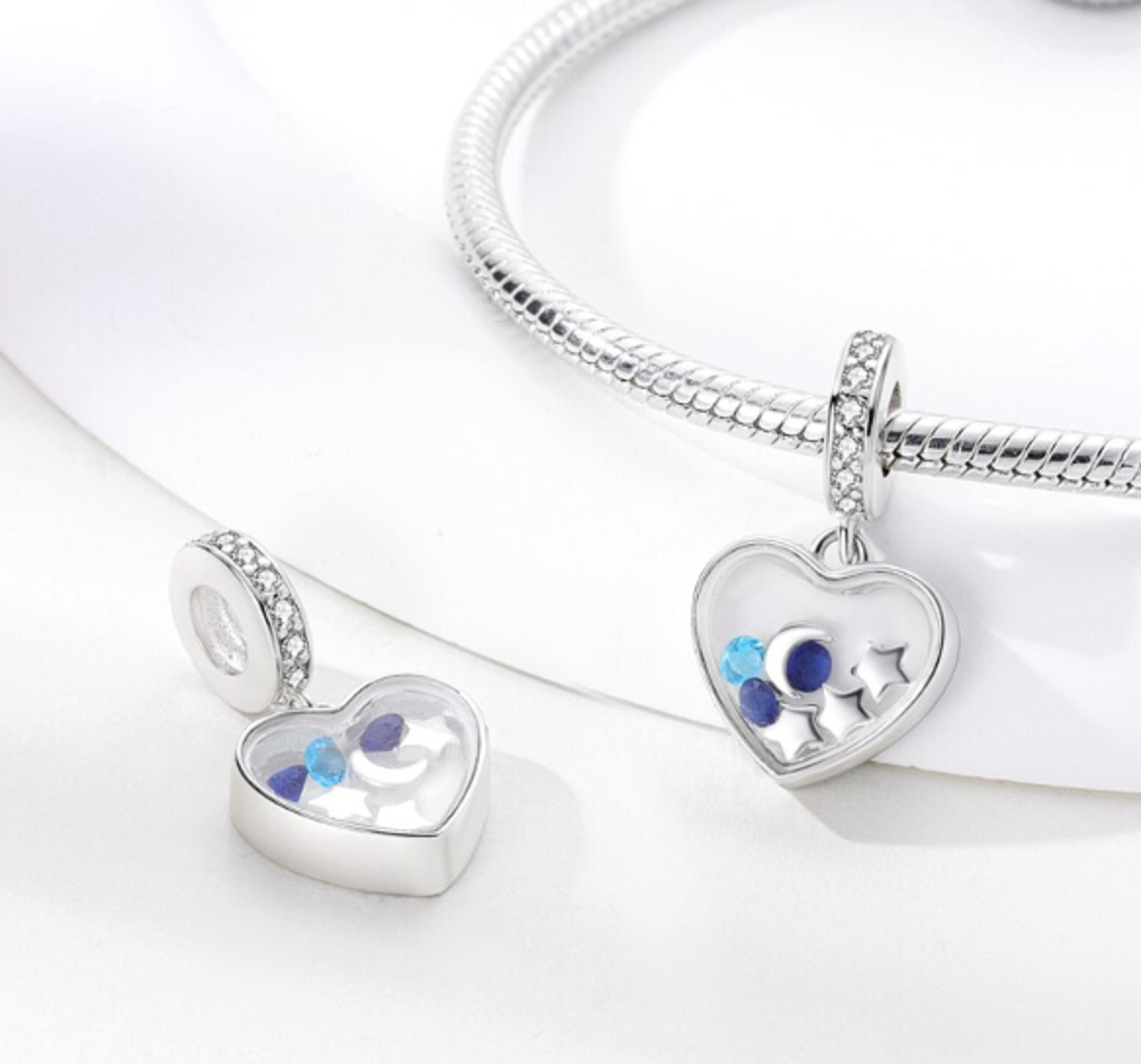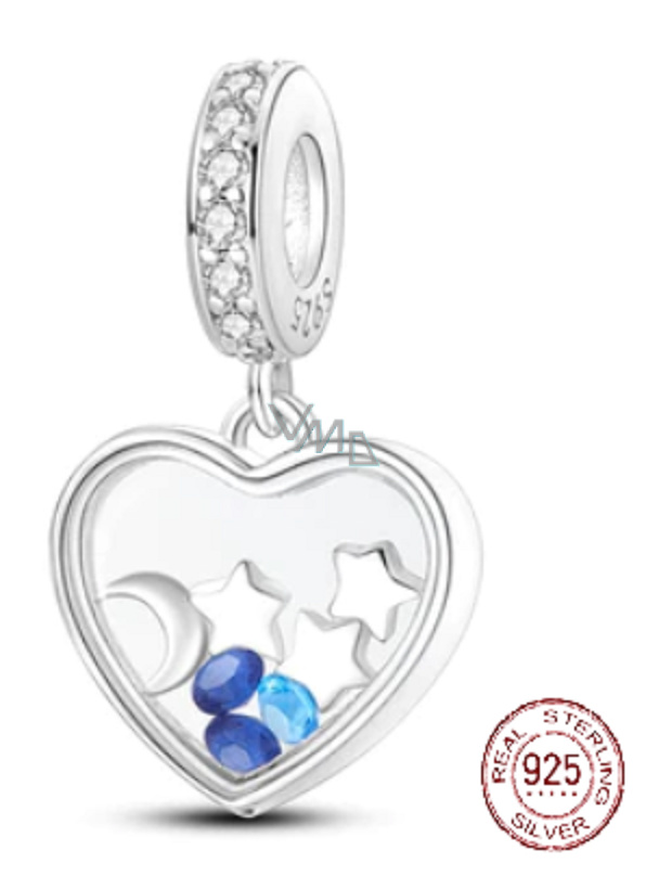 Visací přívěsek 925 Sterling Silver s průhledným srdcem s malým půlMěsícem, hvězdami a odstíny modrých třpytivých drahokamů Zirkonu. Prsten přívěsku obsahuje bílé drahokamy. S každým přívěskem vyprávějte svůj příběh a vytvořte náramek, který odráží, kdo jste a co je pro vás důležité. Tvůj styl. Váš náramek. Tvůj příběh.