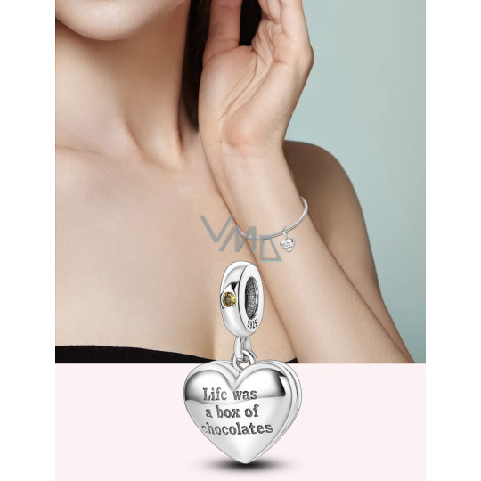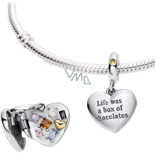 Charm Sterlingové stříbro 925 Nikdy nevíš co dostaneš - krabička na čokoládu ve tvaru srdce, bonboniéra, otevíratelný přívěsek na náramek narozeniny