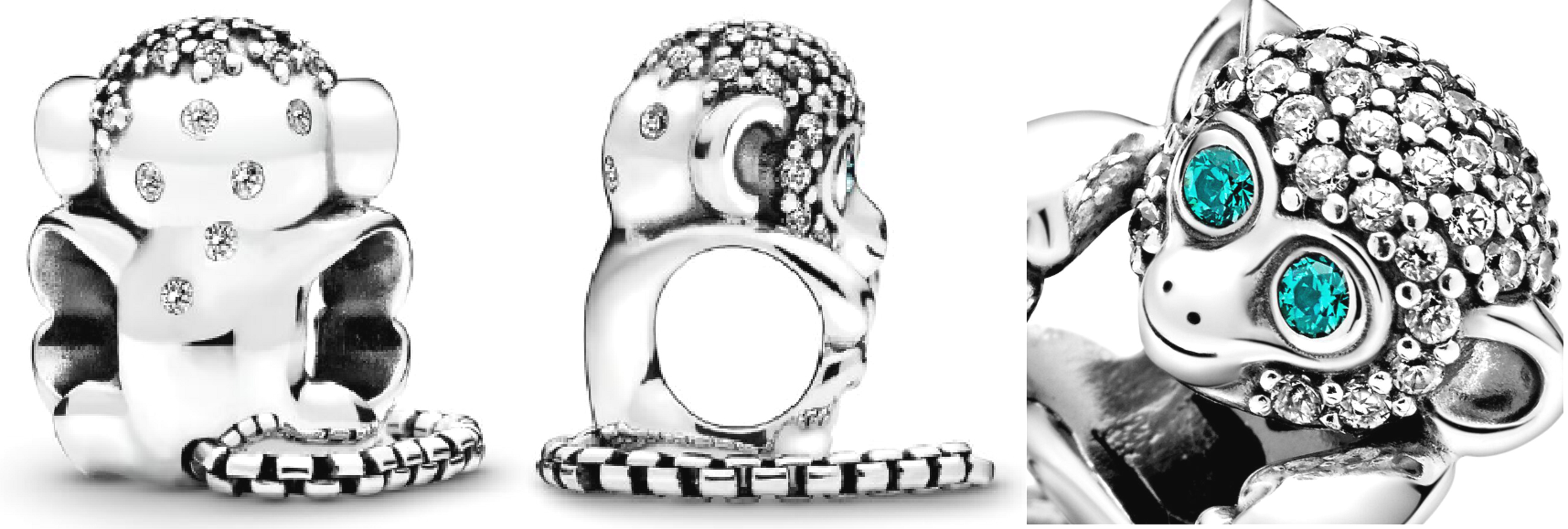 Uvolněte svou divokou stránku s tímto hravým kouzlem opice ze stříbra 925. Její modré oči a HLAVA jsou zdobeny třpytivými kameny. Opice má visící ocas a rozkošné tlapky zdobené srdíčkem, čímž ji dělá velmi roztomilou. Navléká se na šperk přes bříško, ve kterém je vidět povrch náramku nebo náhrdelníku. Noste s dalšími zvířecími kouzly, abyste vytvořili živý zvířecí styl.