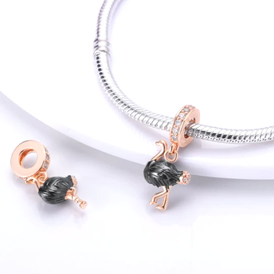 Visací přívěsek 925 Sterling Silver s růžově pozlaceným Pštrosemdekorován hladkým černým smaltem a bílými třpytivými drahokamy Zirkonu. Pštrosi symbolizují sílu a odolnost. S každým přívěskem vyprávěj svůj příběh a vytvoř si náramek, který odráží, kdo jsi. Tvůj styl. Tvůj náramek. Tvůj příběh.