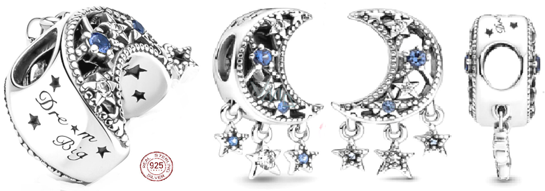 Charm Sterlingové stříbro 925 Půlměsíc a hvězdy, korálek na náramek vesmír