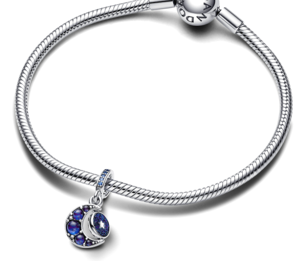 Třpytivé modré kameny a třpytivý smalt se snoubí s přívěskem. Tento přívěsek má tvar půlměsíce s hladkými umělými kabošonovými krystaly ve třech různých odstínech modré, které vytvářejí snový efekt. Malý stříbrný kotouč uvnitř křivky měsíce je navržen tak, aby se otáčel, a má na jedné straně třpytivý smalt a na druhé rytinu „Dreams come true“. Noste tento přívěskový přívěsek ze sterlingového stříbra, který vás bude inspirovat k plnění vašich snů, každý den.