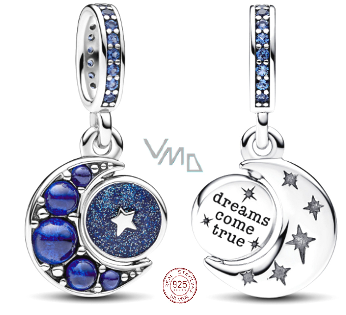 Třpytivé modré kameny a třpytivý smalt se snoubí s přívěskem. Tento přívěsek má tvar půlměsíce s hladkými umělými kabošonovými krystaly ve třech různých odstínech modré, které vytvářejí snový efekt. Malý stříbrný kotouč uvnitř křivky měsíce je navržen tak, aby se otáčel, a má na jedné straně třpytivý smalt a na druhé rytinu „Dreams come true“.Sny se stávají skutečností. Noste tento přívěskový přívěsek ze sterlingového stříbra, který vás bude inspirovat k plnění vašich snů, každý den.