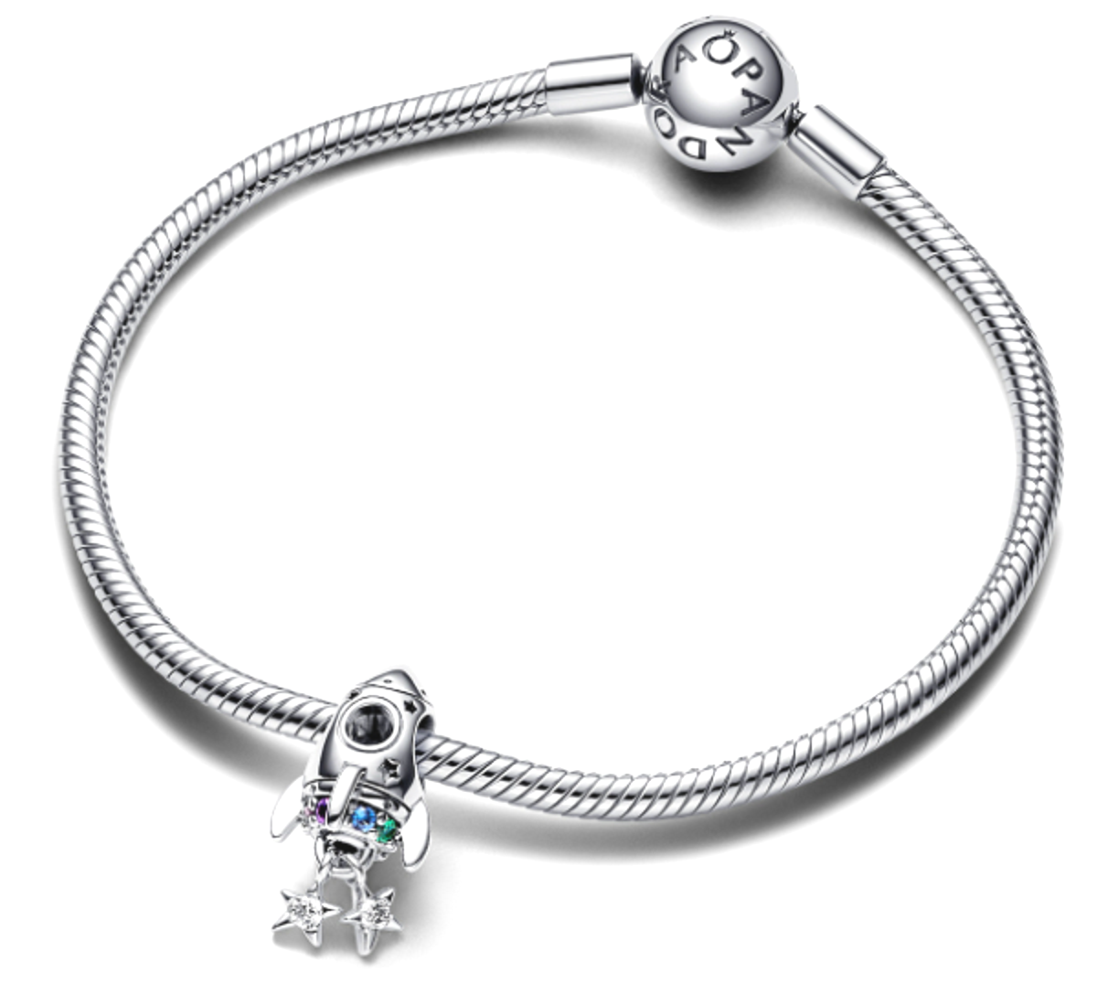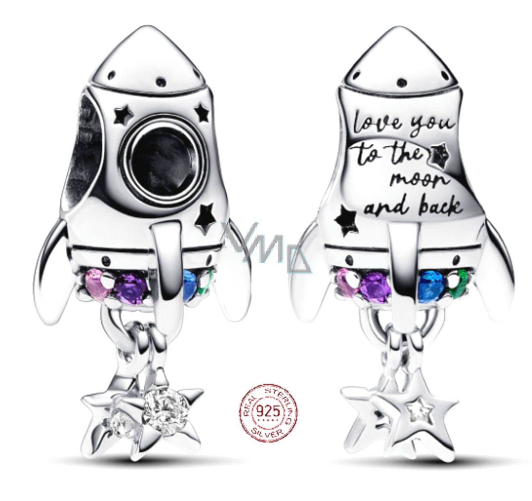 Cestujte ke hvězdám s raketovým přívěskem. Trocha fantazie – a troškou kouzelného Hvězdného prachu – dokazuje, že je vždy možné dosáhnout vysněného cíle. Jedna strana rakety je opatřena kulatým výřezem s detailem rýhované linie, který představuje okno s vyříznutými hvězdami, které jej obklopují. Na druhé straně je rytina „Love you to the moon and back“, zatímco spodní část rakety je poseta barevnými umělými krystaly a má visící Hvězdy. Stříbrné kouzlo, které slouží jako symbol, který nám připomíná, že bez ohledu na to, jak vzdálené se vaše sny mohou zdát, všechno je možné.