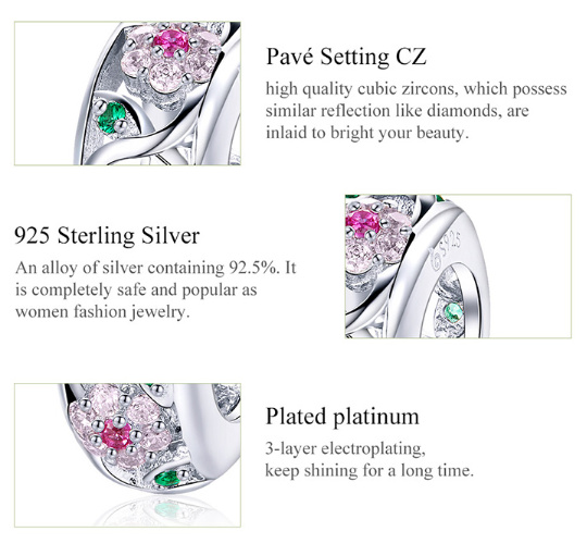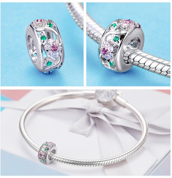 Úzký stříbrný korálek je po obvodu dekorován krásnými kvítky a lístečky, jenž zdobí nádherně se třpytící Zirkony. Tento okouzlující stříbrný korálek je perfektním dárkem pro Vás i Vaše blízké. Objednejte nyní a vytvořte si vlastní nezapomenutelné okamžiky, které si budete připomínat celý život. Mějte na paměti, že korálky nejsou úplně identické v důsledku ruční práce. Stříbrný korálek je kompatibilní pro náramky známých značek. Buďte originální, buďte jedinečná!