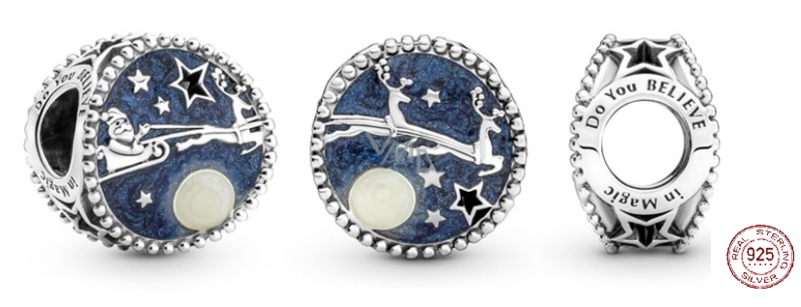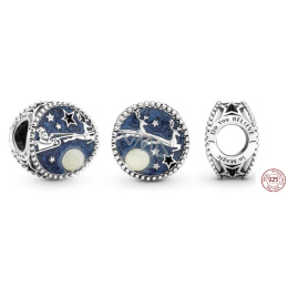 Nechte se nést v duchu Vánoc s okouzlujícím Santou. Přívěsek je ručně vyrobený ze sterlingového stříbra zachycuje magický okamžik, kdy Santa Claus letí po vánoční noční obloze na svých saních a doručuje dárky dětem po celém světě. Oblohu rozzáří měsíc v úplňku v třpytivém bílém smaltu a vztyčené vyřezávané Hvězdy. Na krásném vánočním přívěsku je vyryto „Věříš v magii“ jako připomínka dětského kouzla Vánoc.