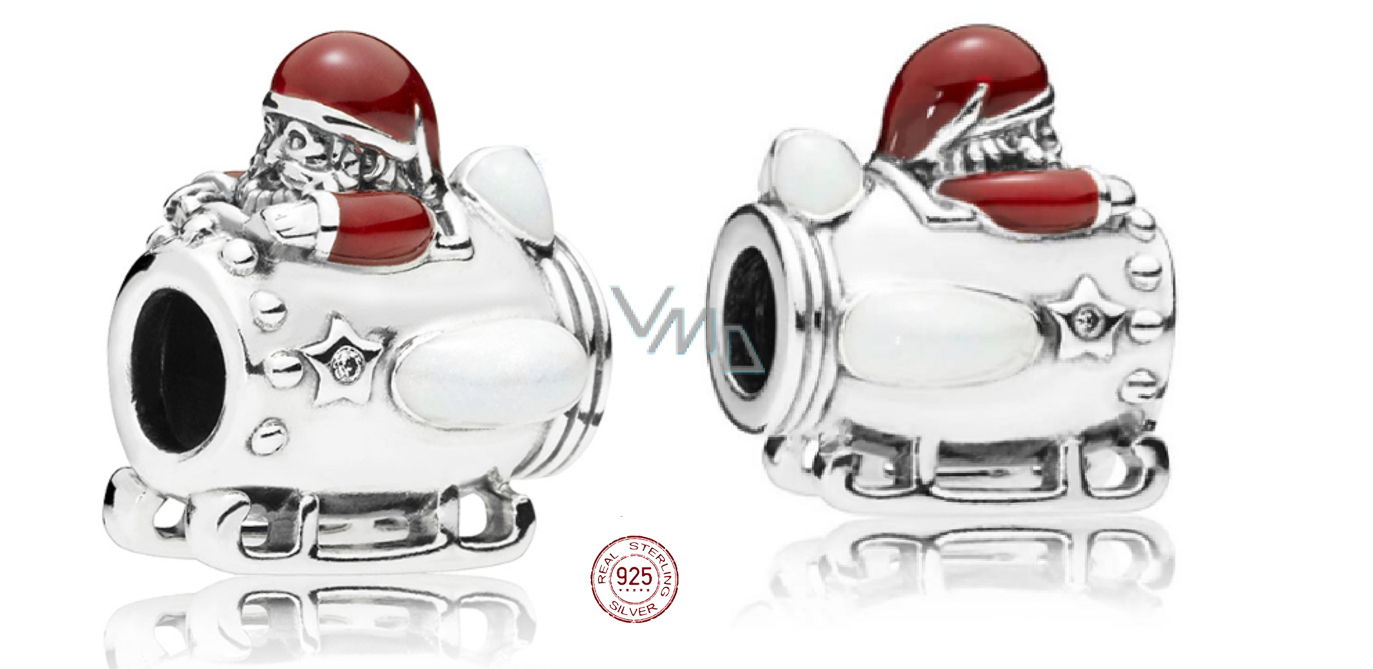 Vánoční přívěsek ze stříbra 925, zdoben smaltem. Korálek Santa je ve velké santovské čepici sedící v raketě. Velká červená čepice zakrývající oči.