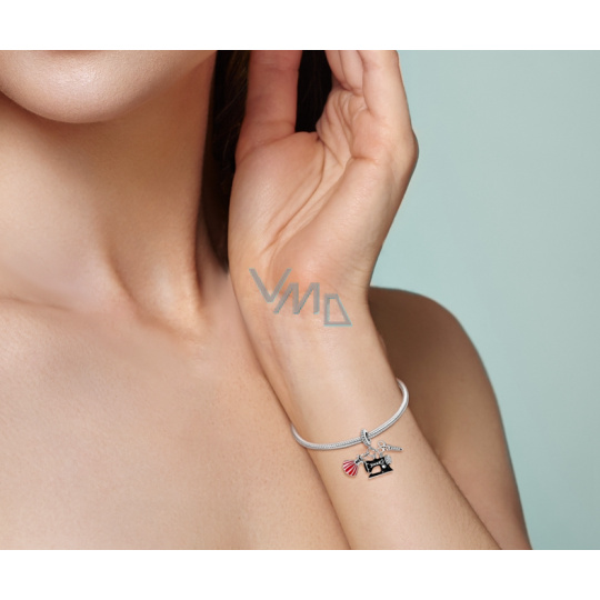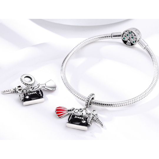 Visací přívěsek 925 Sterling Silver obsahující šicí stroj, šaty a nůžky, dekorované hladkým červeným a černým smaltem a zářivě bílými drahokamy Zirkonu. Na prstenu přívěsku jsou kolem dokola malá srdíčka. Vyprávějte svůj příběh s každým přívěskem a vytvořte náramek, který odráží, kdo jste. Tvůj styl. Váš náramek. Tvůj příběh.