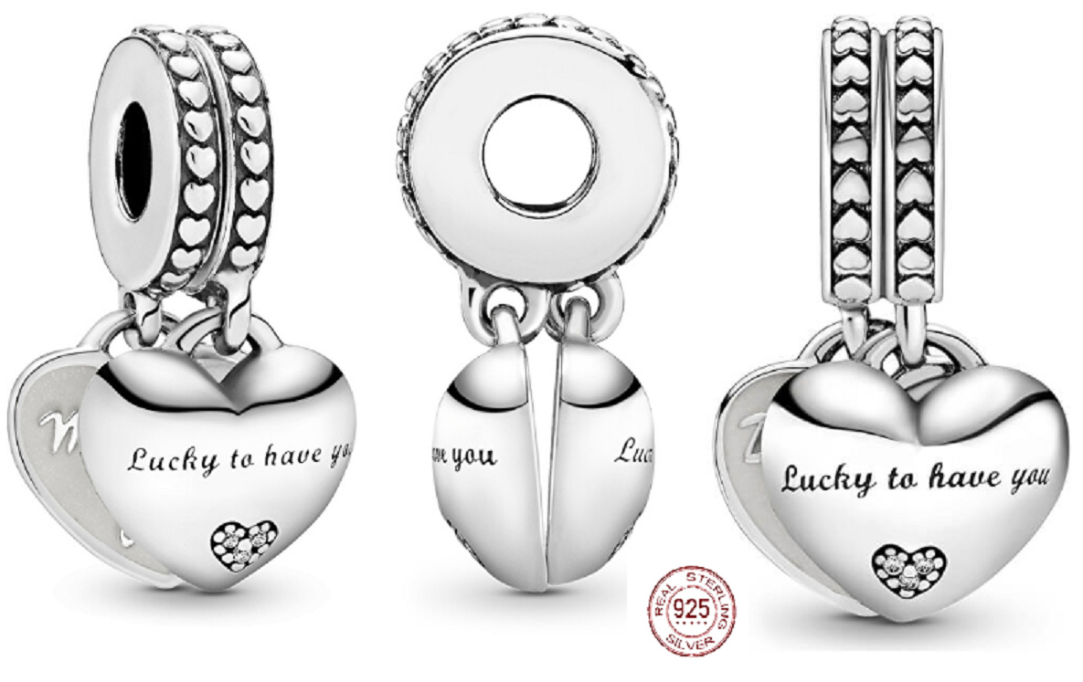 Stylový přívěsek vyrobený ze sterlingového stříbra, visací přívěsky ve tvaru srdce, na vnitřních stranách je povrch ze třpytkaté glazury, s nápisem "Daughter-in-law" Nevlastní dcera a "Mother-in-law" Nevlastní matka, vnější stranu zdobí nápis "Lucky to have you" Štěstí, že tě mám a malé srdíčko zdobené kamínky kubické zirkonie, korálek se dá rozdělit na dvě části. Navléká se na náramky. Ukažte nevěstě nebo své nové tchýni, že na ně myslíte.