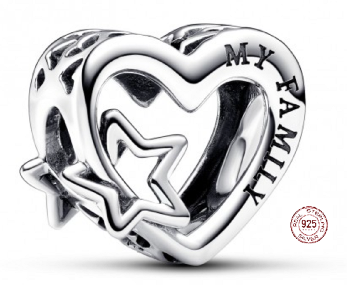 Noste své srdce na ruce s prolamovaným rodinným kouzlem. Motiv srdce a Hvězdy zdobí tento korálek jejich symbolikou je význam rodiny. Dárek pro sebe nebo někoho, koho máte rádi, toto kouzlo obsahuje vyříznuté Hvězdy po stranách přívěsku a větší vyříznutou hvězdu na každé straně srdce. Dva oblíbené motivy se spojí a vytvoří stříbrné kouzlo, které září (téměř) tak jasně jako ty, které milujete nejvíce.
