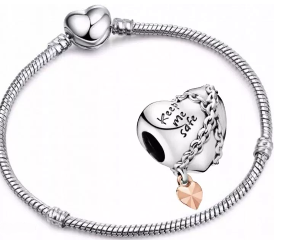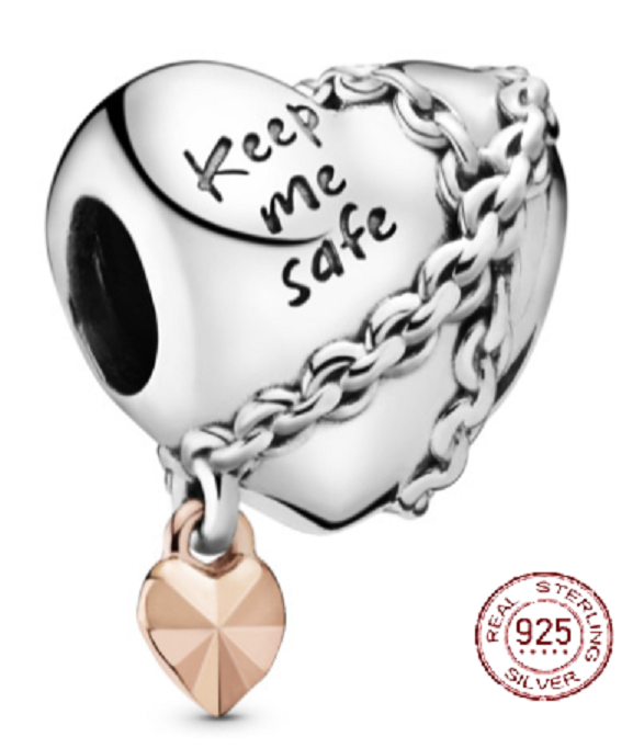 Udělejte své manželce či přítelkyni radost a darujte jí korálek, který bude skutečným vyjádřením lásky. Korálek ve tvaru srdce s nápisem "Keep me safe" - Udrž mě v bezpečí je omataný jemným řetízkem, na jehož konci je drobné visací srdíčko z růžového pozlaceného zlata. Tento okouzlující stříbrný korálek je perfektním dárkem pro Vás i Vaše blízké.