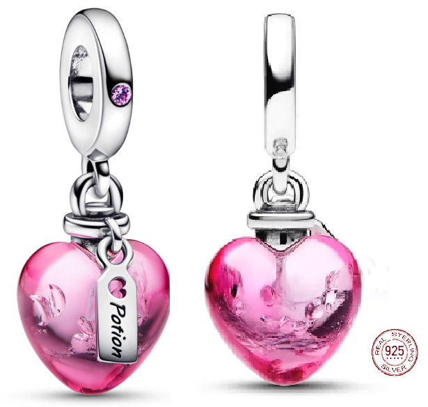 Přidejte si do sbírky okouzlující visací přívěsek Srdce s elixírem lásky z Murano skla. růžové gradientní srdce z Murano skla se známkou ze stříbra zdobenou rytinou „Potion“ Lektvar, vyvolává neobvyklé kouzlo. Očko zdobí jeden růžový umělý krystal s briliantovým výbrusem a dodává šperku romantický nádech.