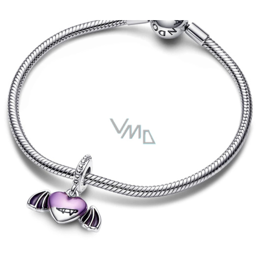 Tento zábavný přívěsek je zdoben průhledným stínovaným smaltem, který vytváří přechod od stříbrné po fialovou barvu přes srdce. Leštěná stříbrná křídla s drážkovanými detaily dodávají designu strašidelný prvek spolu s leptaným úsměvem s tesáky na přední straně přívěsku. Přidejte tento nádherně děsivý symbol na svůj náramek, abyste se dostali do ducha nejstrašidelnějšího období roku.