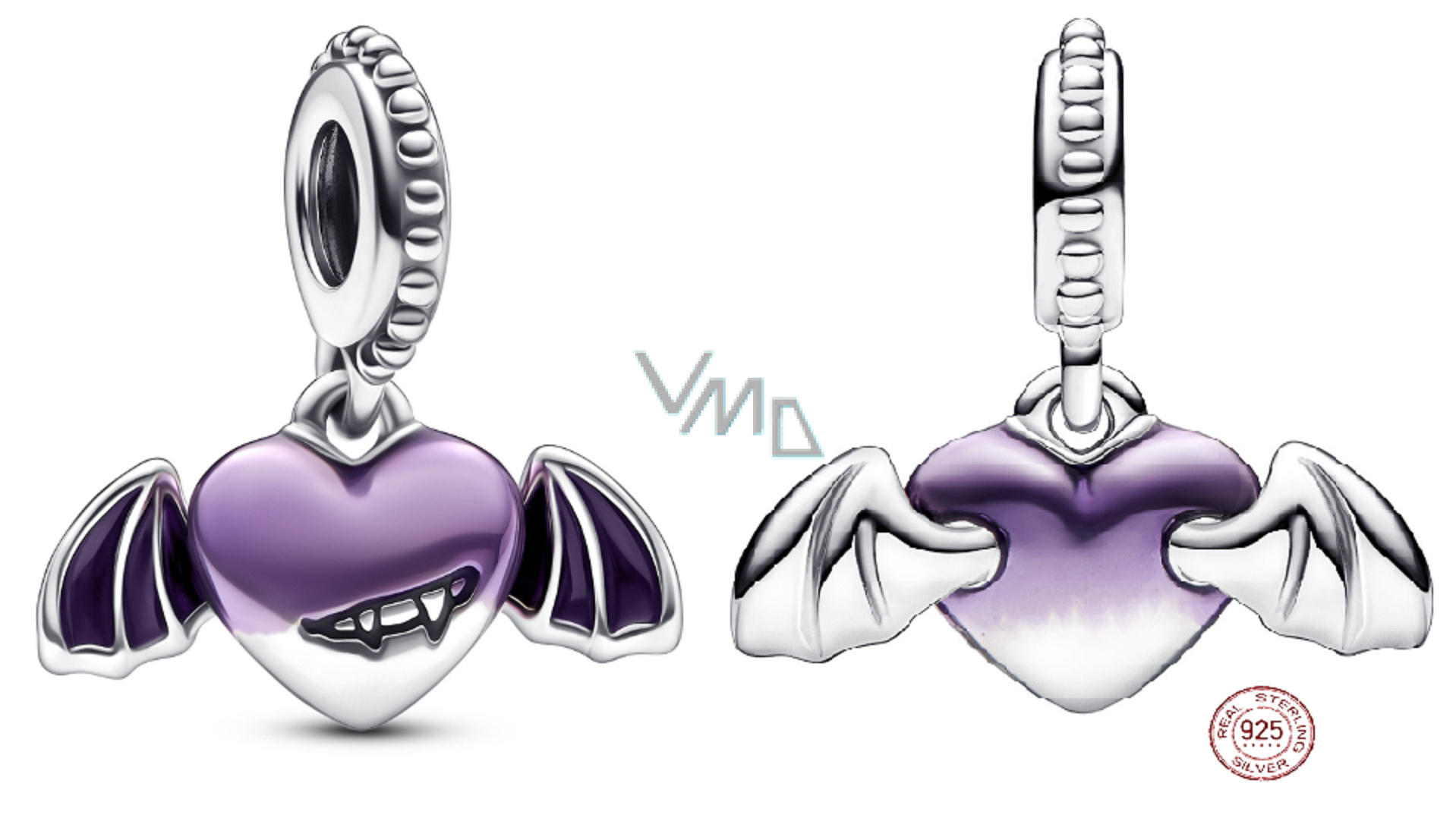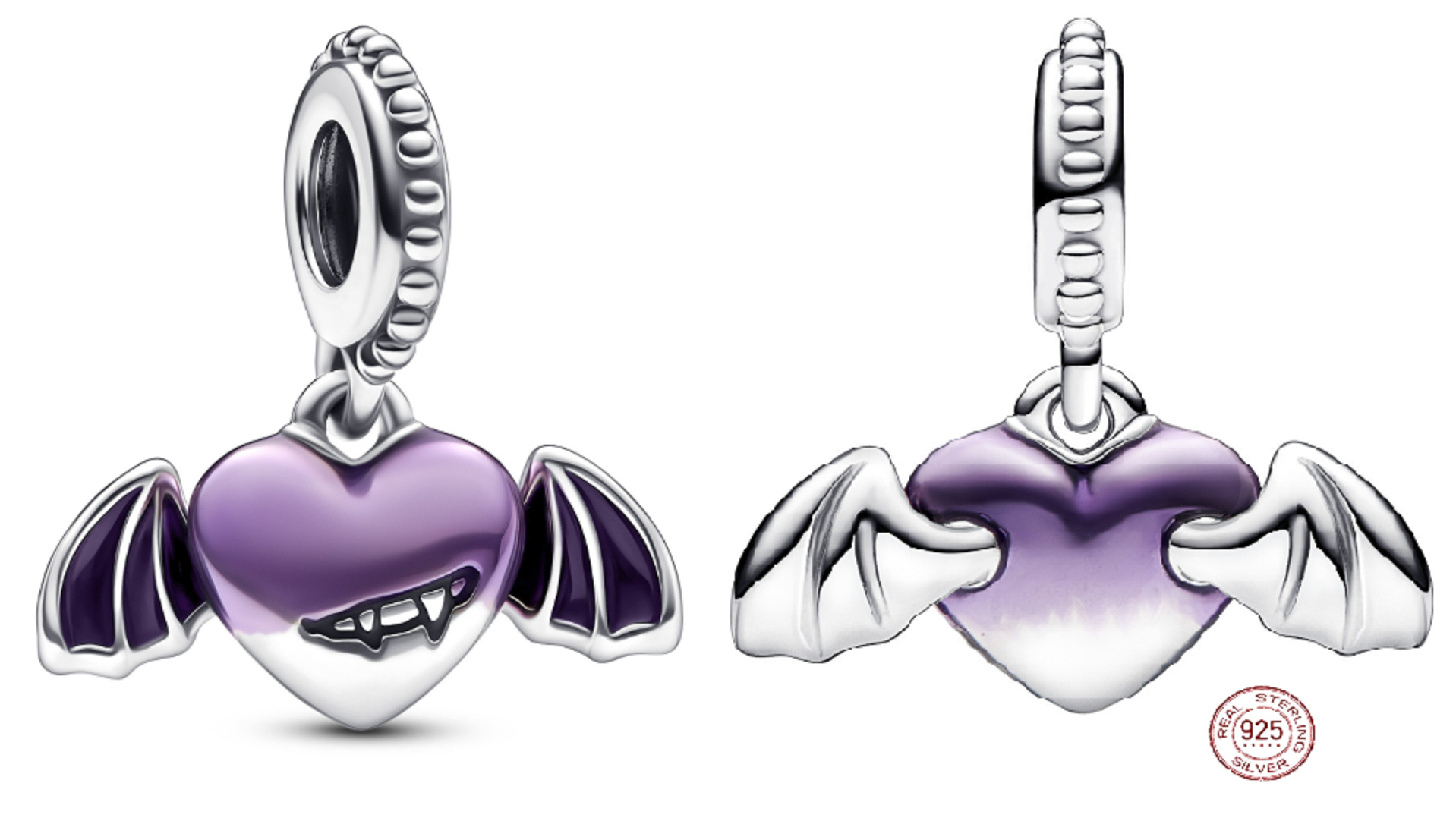 Upíří srdce s křídly, tento zábavný přívěsek je zdoben průhledným stínovaným smaltem, který vytváří přechod od stříbrné po fialovou barvu přes srdce. Leštěná stříbrná křídla s drážkovanými detaily dodávají designu strašidelný prvek spolu s leptaným úsměvem s tesáky na přední straně přívěsku. Přidejte tento nádherně děsivý symbol na svůj náramek, abyste se dostali do ducha nejstrašidelnějšího období roku.