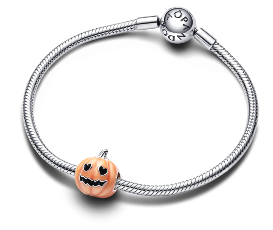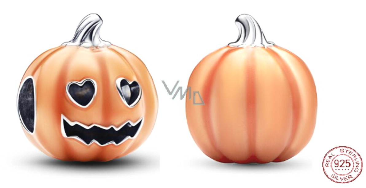Svítí ve tmě. Přívěsek Trick or Treat Glow in the Dark, dýně ze 925 stříbra, pokrytý světélkující terakota barvou. Vyřezávaná dýně ve tvaru Lucerny - „Celé tělo“ dýně využívá proces světelného smaltu. Přívěsek dýně má celé tělo pokryto realistickými detaily drážek, na jedné straně je vyřezáno duté srdce - tvar očí a zoubkovaná ústa, kompletní horní a spodní sTonky, mincovní stříbro, s rýhovaným detailem na horním dýňovém stonku. Přívěsek je inspirován Halloweenskou lucernou, strašidelná, a přesto hřejivá oslava Halloweenu, nahnědlé podzimní dojmy a zábavné prázdninové rodinné aktivity, jako je vyřezávání dýní.
