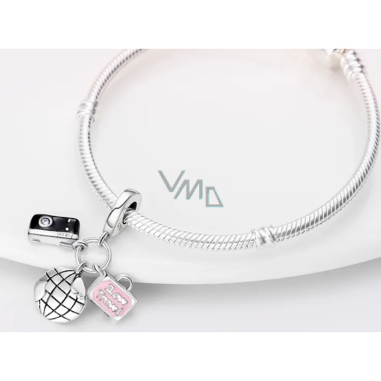 Charm Sterlingové stříbro 925 Zeměkoule, fotoaparát, růžový kufr 3v1, přívěsek na náramek cestování