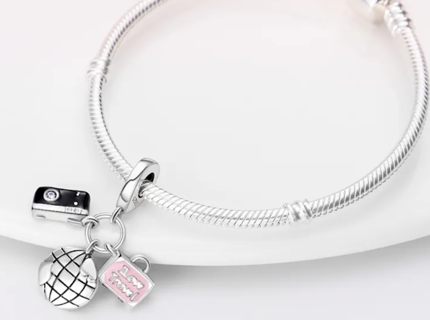 Charm Sterlingové stříbro 925 Zeměkoule, fotoaparát, růžový kufr 3v1, přívěsek na náramek cestování