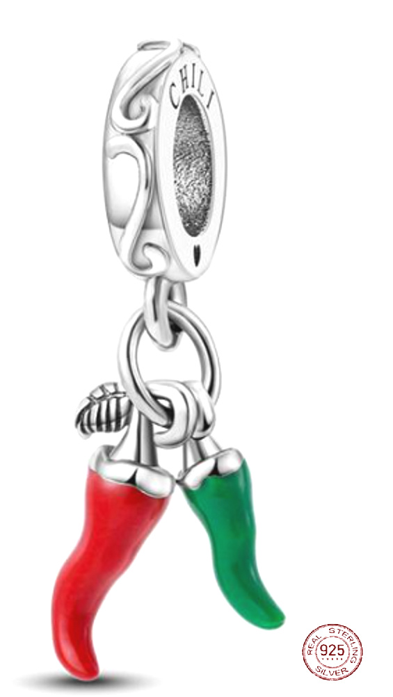 Charm Sterlingové stříbro 925 Chilli paprička - pro milovníky dobré kuchyně, 2v1 přívěsek na náramek, jídlo a pití