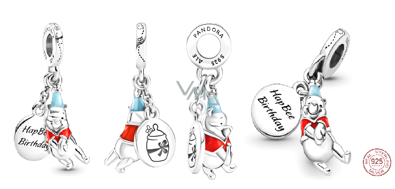 Přívěsek vyrobený ze stříbra a složený ze dvou částí, zdobený medvídkem Pú v červeném tričku a medailonkem s Medem a nápisem "Happy Birthday" (Krásné narozeniny). Roztomilý přívěsek rozveselí váš náramek. Ať už si chcete připomenout zvláštní okamžik nebo jednoduše dodat svému náramku jiskru, toto kouzlo ze sterlingového stříbra určitě udělá dojem. Přidejte si ji tedy do své sbírky ještě dnes a užívejte si její nadčasovou krásu v nadcházejících letech!