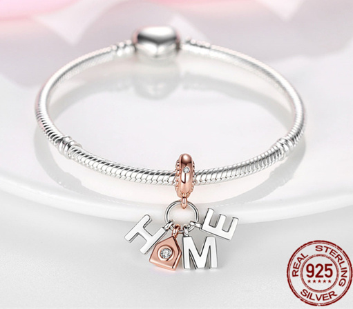 Visací přívěsek s písmeny, která vysvětlují slovo „Home“. Písmeno „o“ představuje malý domeček pozlacený růžovým zlatem, zdobený bílým třpytivým Zirkonem. Prsten přívěsku je rovněž pozlacený růžovým zlatem a zdobený bílým třpytivým Zirkonem.
