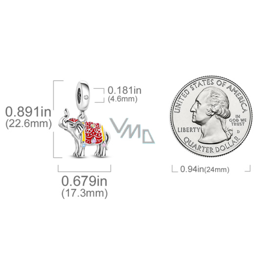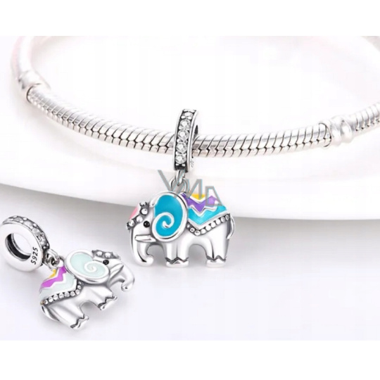 Visací přívěsek 925 Sterling Silver s indickým Slonem oblečeným v jasných barvách, navržený se smaltem a třpytivými drahokamy Zirkonu. Sloni symbolizují božství a královské hodnosti a jsou indickým kulturním symbolem míru a duševní síly.
