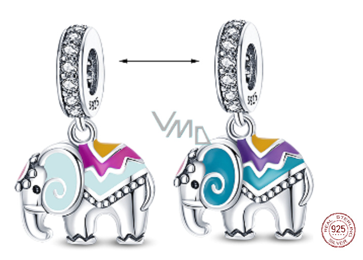 Visací přívěsek 925 Sterling Silver s indickým Slonem oblečeným v jasných barvách, navržený se smaltem a třpytivými drahokamy Zirkonu. Sloni symbolizují božství a královské hodnosti a jsou indickým kulturním symbolem míru a duševní síly.