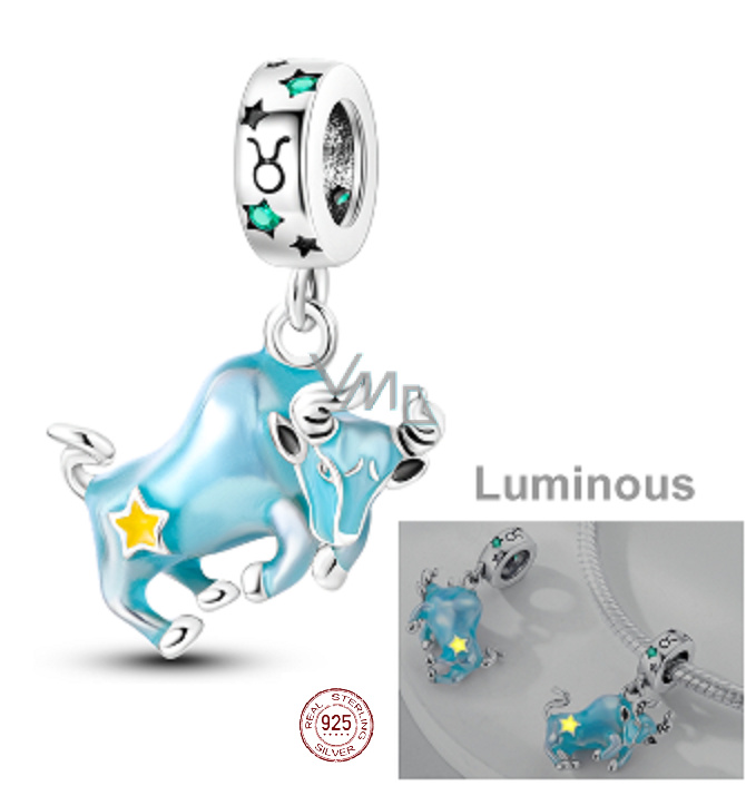 Charm Sterlingové stříbro 925 Znamení zvěrokruhu Býk, zářící ve tmě luminozní přívěsek na náramek